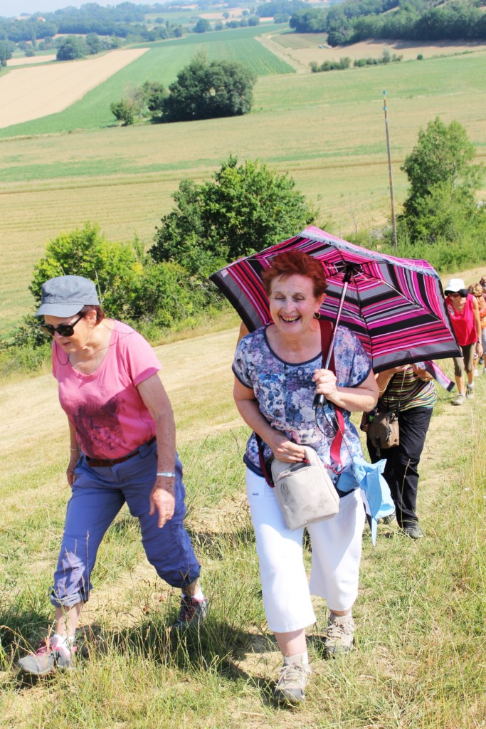 C’était le moment d’ouvrir les parapluie,de remettre les chapeaux ! La petite côte nous a donné l’occasion d’éliminer les toxines accumulées pendant l’ hiver.La chaleur peut avoir du bon ! A la Guinguette, un petit punch bien frais nous attendait sous la tonnelle. Le repas fut « chaleureux » . Si le carry avait un accent réunionnais, le poulet était bien gersois! la chair tenait solidement à l’os !
