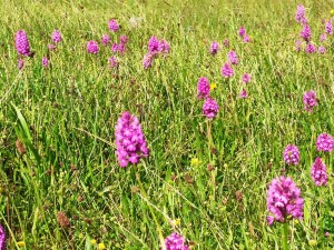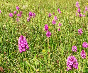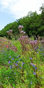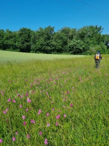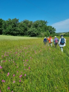 Au départ le sentier était balisé et les randonneurs se disaient qu’ils pourraient à l’occasion faire découvrir cette rando à d’autres de leurs connaissances …. Mais Simone avait tout autre chose en tête : un sentier, un petit bout de route , un chemin moins défini, un champ , et l’on tourne à droite, coupe à gauche …. Advint que l’on eut le tournis !! Mieux valait ne pas la perdre de vue…et l’on abandonna l’idée de mémoriser ce dédale de la campagne « roquefortine » au profit d’une attention portée aux fleurs et à toute plante. Champs de fèves, champs d’avoine et de blé tantôt blonds tantôt encore verts, présence rassurante de coquelicots assez nombreux  en bordure de champs , prés jonchés d’orchidées roses, discrètes fleurs de Nigel à débusquer, chardons au meilleur de leur floraison mauve..