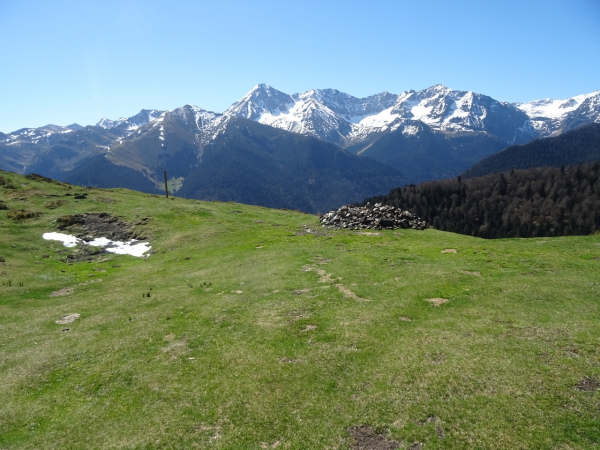 En contrebas nous pouvons apercevoir une petite cabane jaune près des fontaines de las Aygues et à notre gauche au loin le casque de Lhéris, le soum Arra et le signal de Bassia.