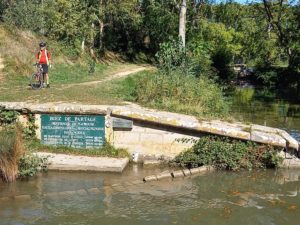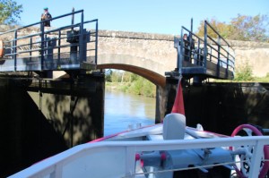 Ecluse d’Emborrel, écluse d’Encassan… D’écluse en écluse, la même magie! Le tumulte assourdissant de l’eau s’engouffrant impétueusement dans les vannes, la lente descente du bateau, les manoeuvres précises du batelier… Nous voici déjà arrivés à l’écluse de Renneville où l’équipage négocie habilement un accostage tout en douceur. Pas le moindre tangage.