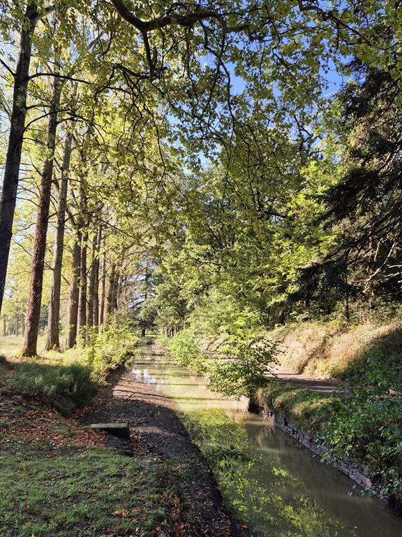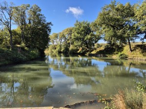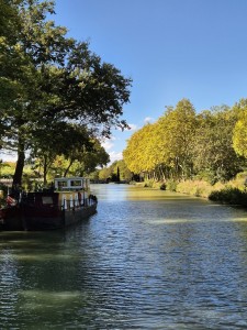 Lentement la péniche glisse enserrée par les berges où déjà les arbres se colorent délicatement des teintes d’un automne naissant. Peupliers, aulnes, platanes! Une voûte arborée! L’eau est son miroir… peu à peu, flouté par le sillage de l’embarcation son reflet s’estompe jusqu’à s’évanouir dans l’écume blanchâtre. Des chênes chevelus récemment plantés remplacent les platanes décimés par les attaques d’un champignon ravageur, le chancre coloré.