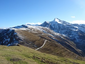 La montée se fait par une bonne piste en lacets, d’abord en forêt, dans la fraîcheur, puis à découvert, avec le soleil de plus en plus présent, au fur et à mesure de l’avancée, avec une vue à 360° .