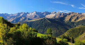 Un panorama splendide  s’offre déjà à nous : en bas la vallée de Bagnères de Luchon et au fond toute une chaîne de sommets : Aneto (3404 m),  la Maladetta avec son glacier, le Venasque et  le Sauvegarde et devant la station de Superbagnères, puis les névés du Maupas, le Perdiguère, la station des Agudes et le Peyresourde, enfin plus à l’ouest l’Arbizon.