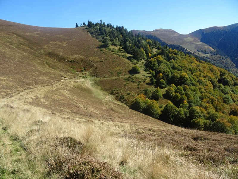 Le soleil a fini de percer la brume matinale  quand nous commençons notre ascension en empruntant le GR10. Christian et Bernard ont prévu un trajet en boucle, avec un  dénivelé  d’environ 500 m, dont  la pente progressive nous laisse le loisir d’apprécier la beauté des différents étages de végétation, le sentier initialement bordé de noisetiers et de frênes,  puis de hêtres et de sapins, laissant progressivement  place à un paysage de prairies à découvert . A mesure que nous grimpons, leur herbe verte (que broutent  encore quelques vaches – bretonnes ! – dans un pré clos), s’assèche et jaunit, progressivement remplacée par des myrtilliers et de la bruyère, asséchée elle aussi par la trop longue canicule estivale. La fleur mauve des nombreux  colchiques éclaire avec bonheur  la tonalité d’arrière saison de la végétation. Les poètes du groupe s’en donnent à coeur joie, les photographes photographient à tout rompre, tandis que de son œil de botaniste curieux et attentif, Pascal repère un dernier et minuscule bourdon pollinisant dans une fleur.