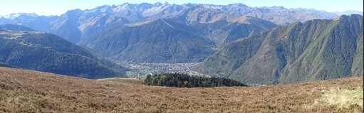 Un panorama splendide  s’offre déjà à nous : en bas la vallée de Bagnères de Luchon et au fond toute une chaîne de sommets : Aneto (3404 m),  la Maladetta avec son glacier, le Venasque et  le Sauvegarde et devant la station de Superbagnères, puis les névés du Maupas, le Perdiguère, la station des Agudes et le Peyresourde, enfin plus à l’ouest l’Arbizon.