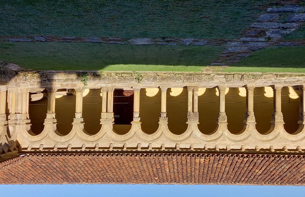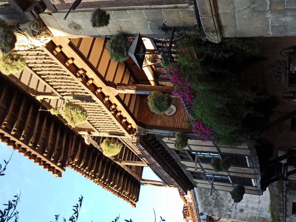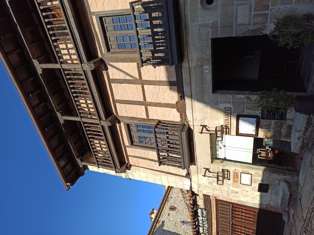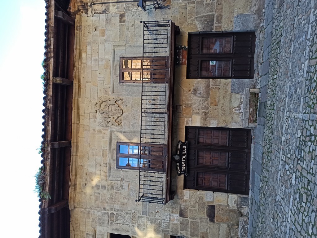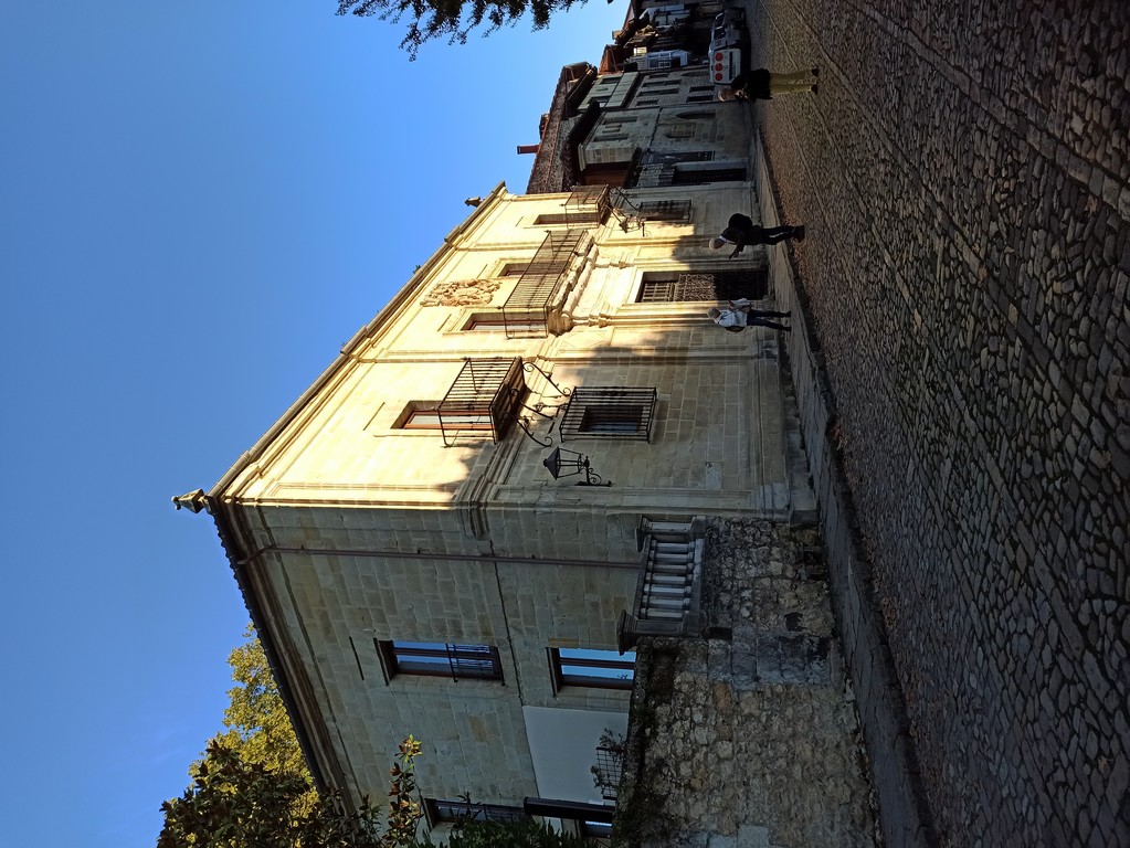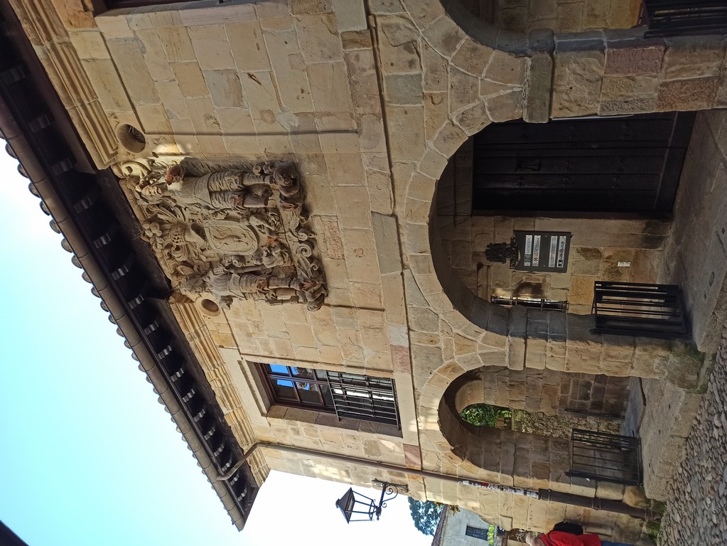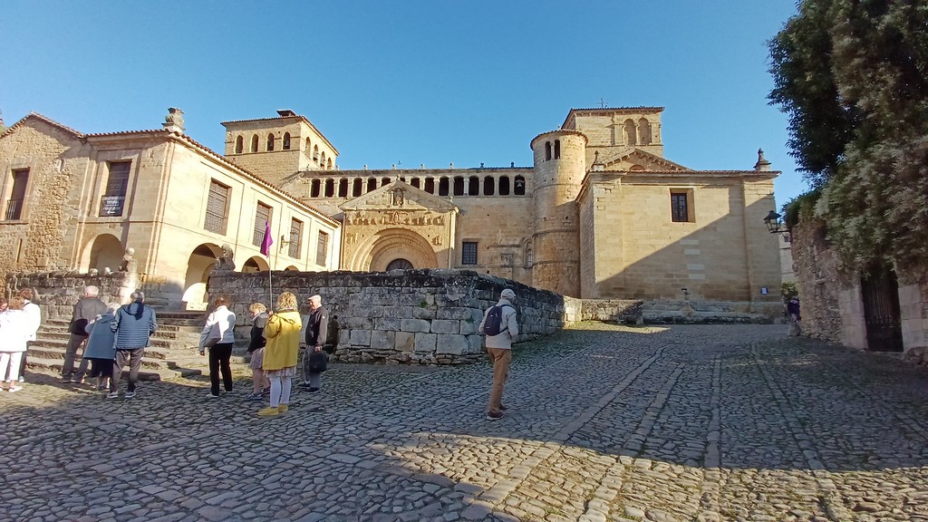 On peut y admirer son église romane avec son portail orné de sculptures dont celle de Sainte Julienne, son corps repose dans un sarcophage du XVème siècle, et dans la collégiale un grand retable lui est dédié. Le cloître possède des chapiteaux sculptés dont les décorations varient, avec des motifs végétaux ou des épisodes liés à la vie du Christ. Carmen nous fait remarquer un motif plus original : une femme qui tient un lys (symbole de pureté) un chien (symbole de fidélité) accompagne la scène tandis que les sabots du cheval écrasent un serpent (symbole de trahison). Plusieurs palais armoiries, construits en pierre possèdent des balcons en fer forgé dont la forme varie selon le statut des propriétaires, alors que les maisons du peuple n’ont que des balcons en bois. Cet ancien village rural possède toujours son abreuvoir où buvaient les vaches. Grâce à notre arrivée tôt le matin, le groupe n’est pas gêné par le flot des touristes qui envahissent peu à peu ce bourg, un des plus beaux d’Espagne, et si bien conservé même s’il n’est pas au bord de la mer, contrairement à son appellation.