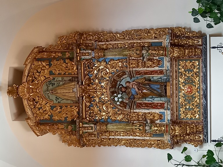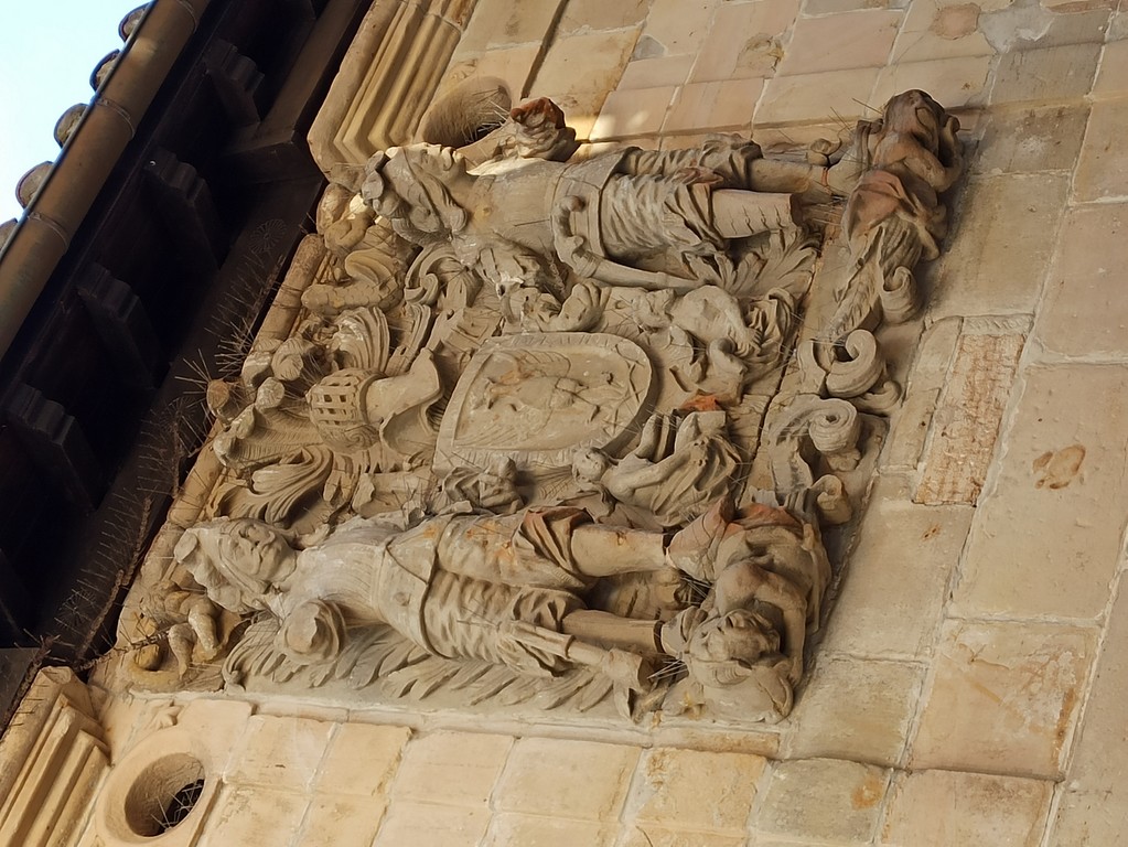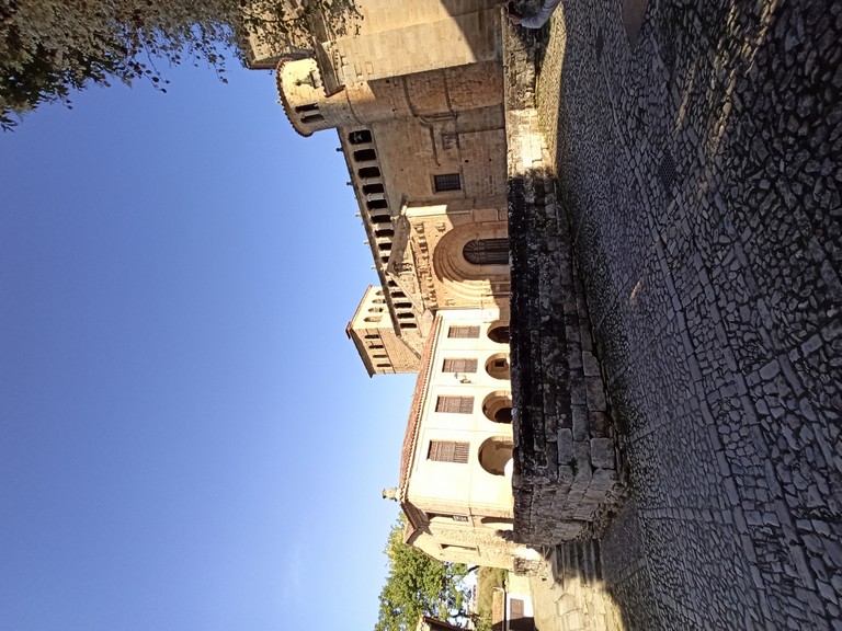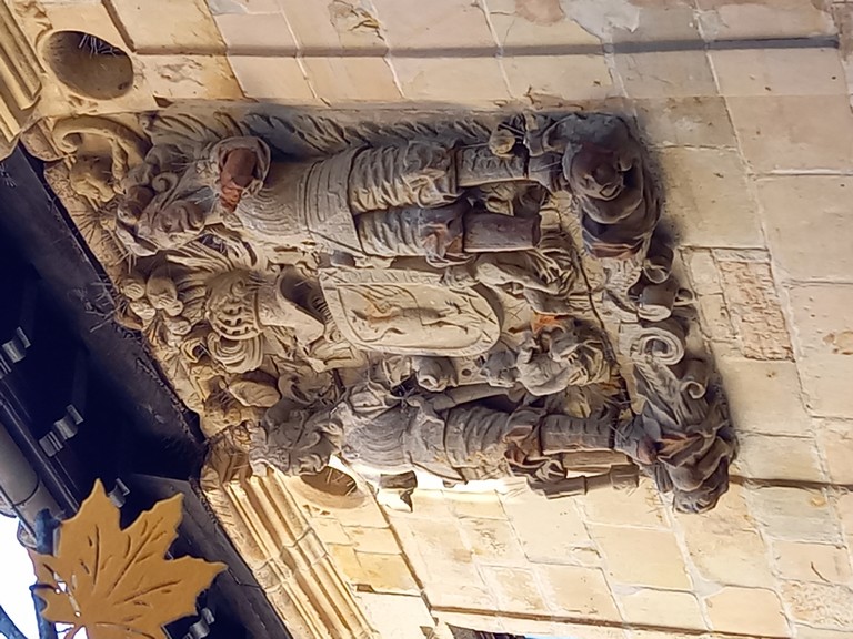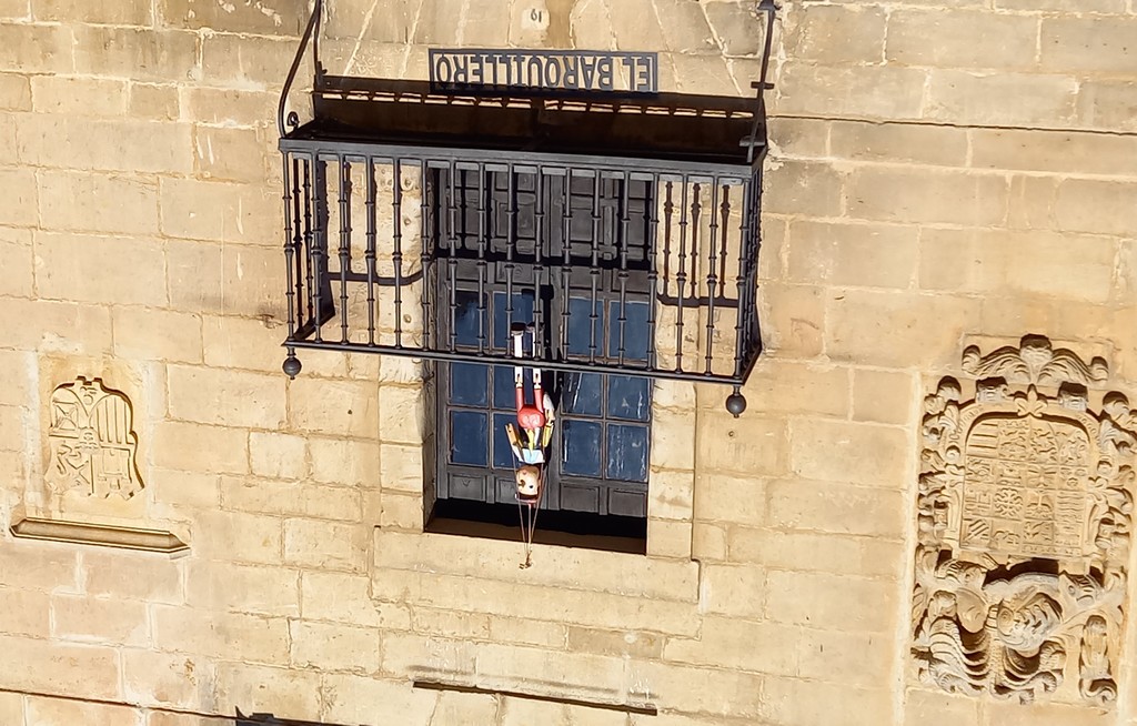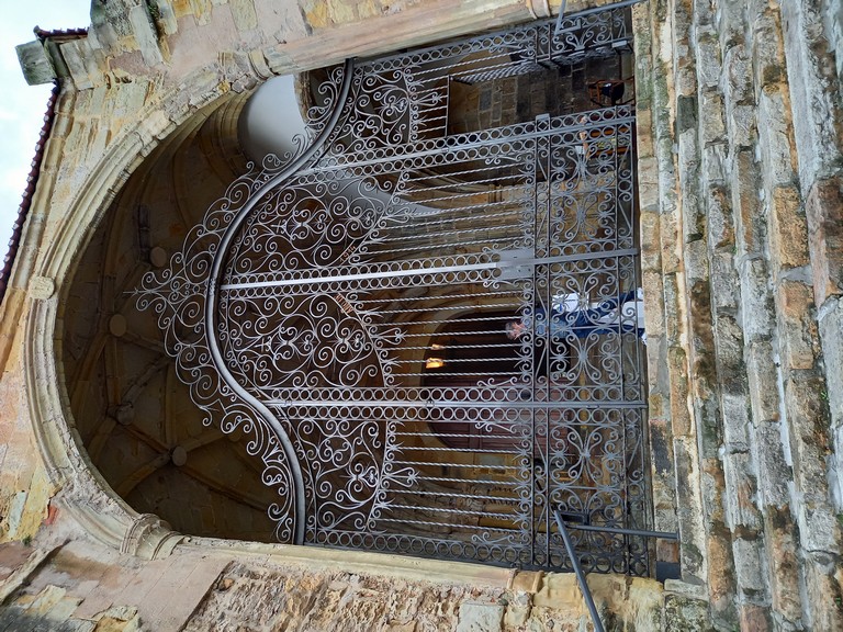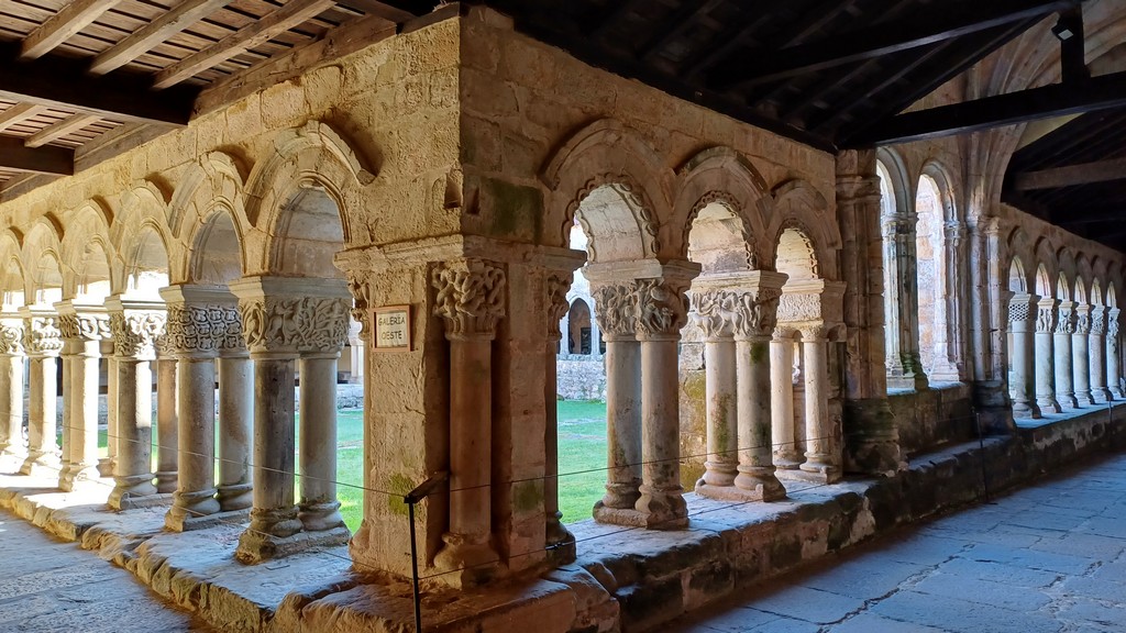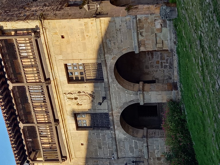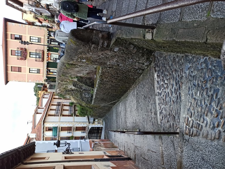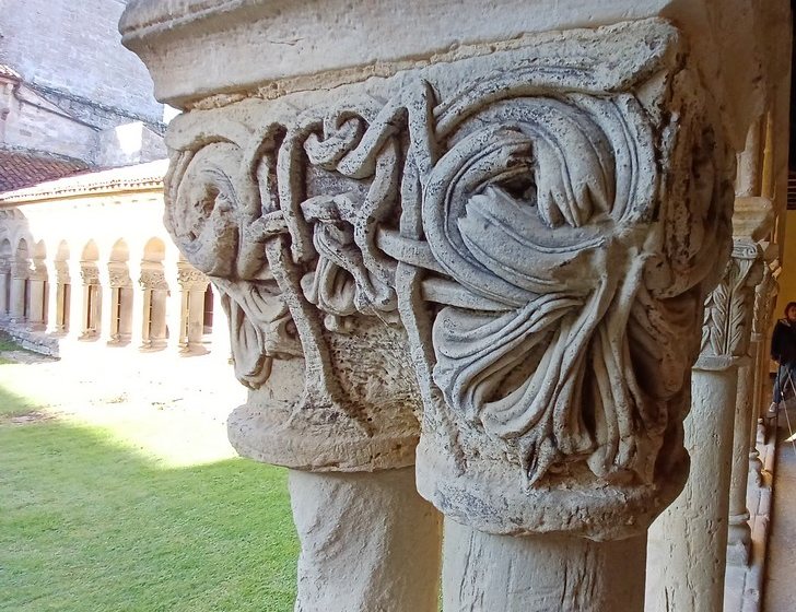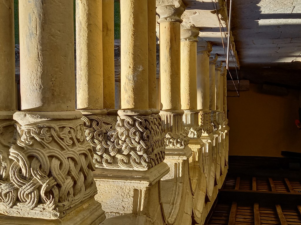 On peut y admirer son église romane avec son portail orné de sculptures dont celle de Sainte Julienne, son corps repose dans un sarcophage du XVème siècle, et dans la collégiale un grand retable lui est dédié. Le cloître possède des chapiteaux sculptés dont les décorations varient, avec des motifs végétaux ou des épisodes liés à la vie du Christ. Carmen nous fait remarquer un motif plus original : une femme qui tient un lys (symbole de pureté) un chien (symbole de fidélité) accompagne la scène tandis que les sabots du cheval écrasent un serpent (symbole de trahison). Plusieurs palais armoiries, construits en pierre possèdent des balcons en fer forgé dont la forme varie selon le statut des propriétaires, alors que les maisons du peuple n’ont que des balcons en bois. Cet ancien village rural possède toujours son abreuvoir où buvaient les vaches. Grâce à notre arrivée tôt le matin, le groupe n’est pas gêné par le flot des touristes qui envahissent peu à peu ce bourg, un des plus beaux d’Espagne, et si bien conservé même s’il n’est pas au bord de la mer, contrairement à son appellation.