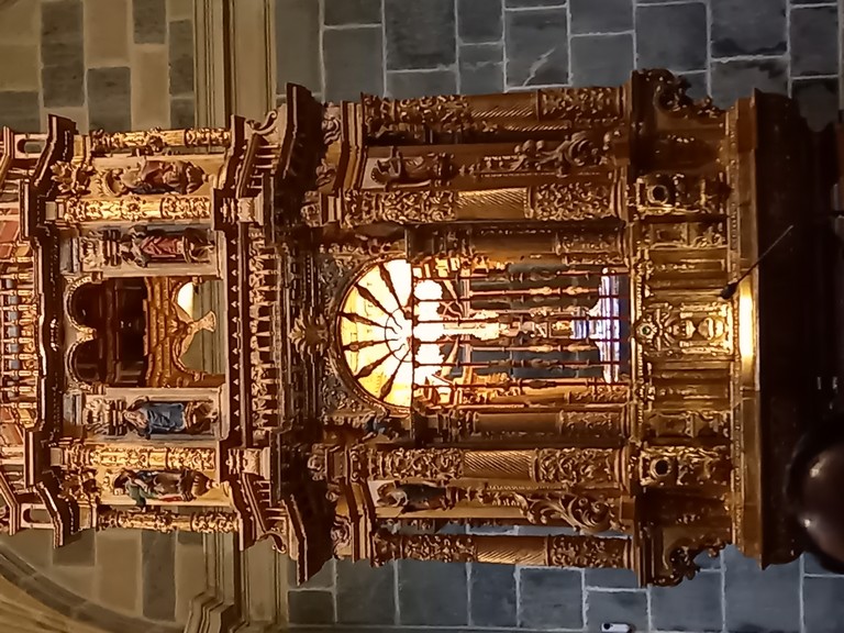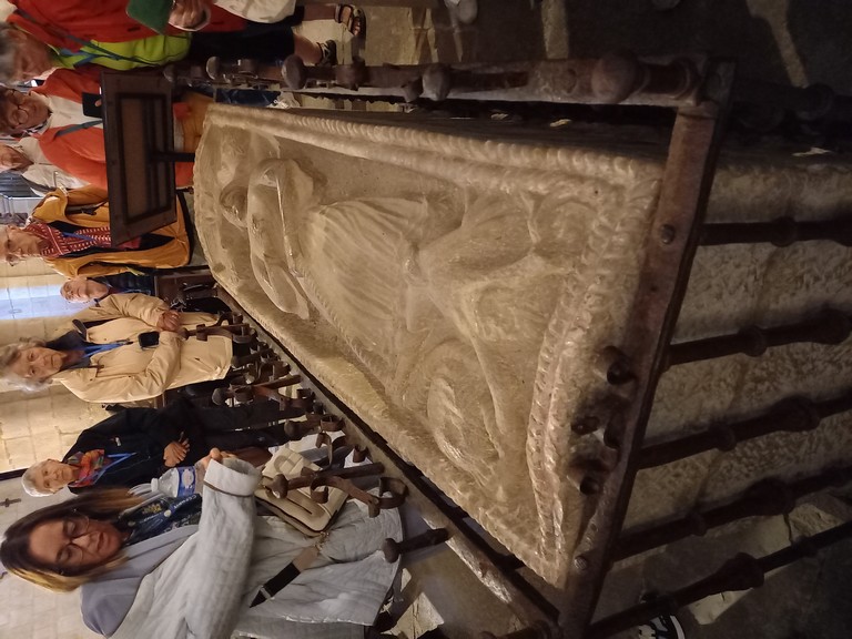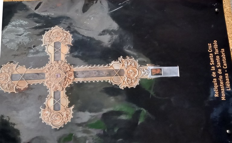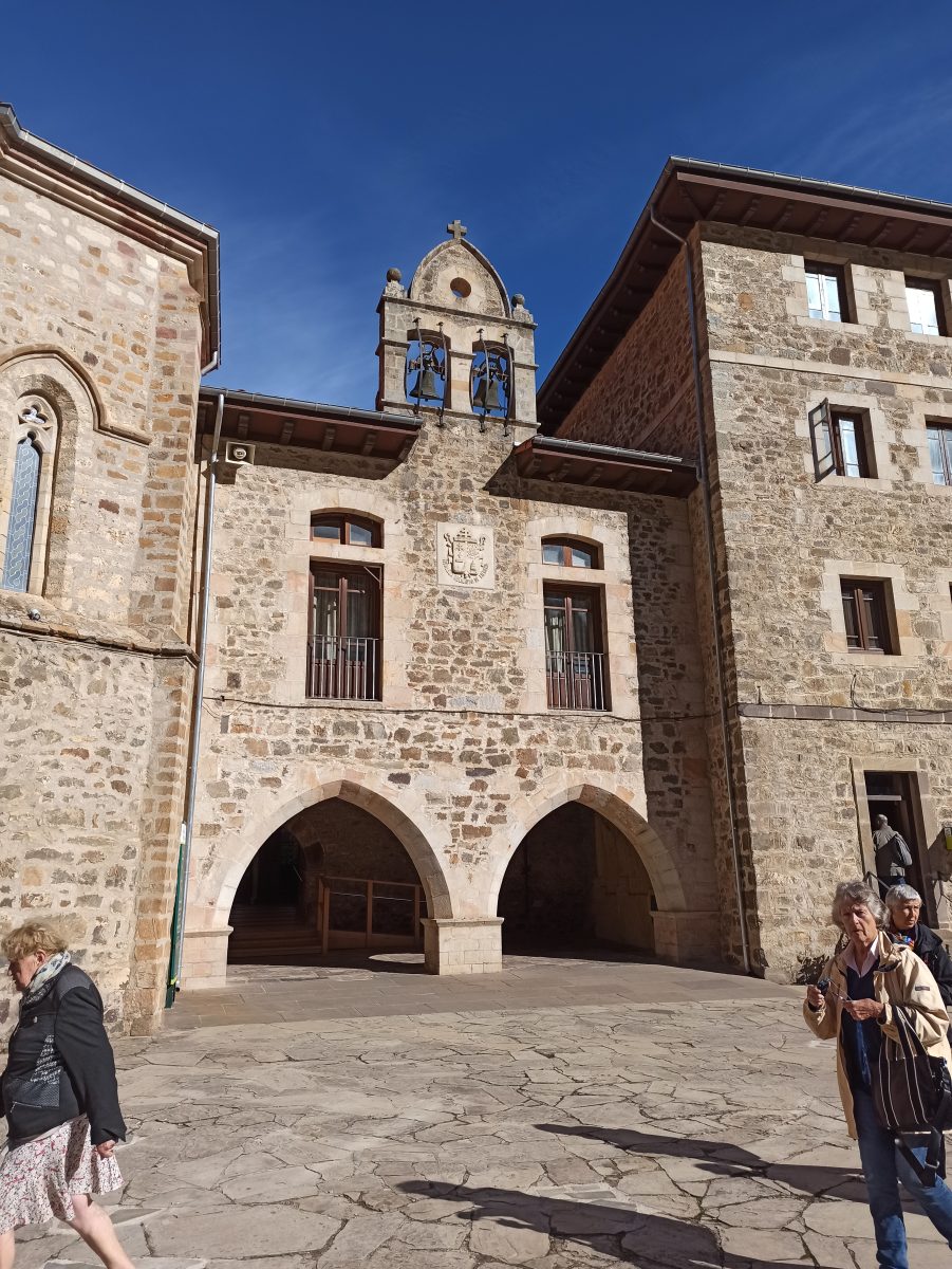 Nous revenons à notre destination de la matinée : les Pics d’Europe ainsi appelés par les matelots qui arrivaient des Amériques et apercevaient, enfin, le continent européen. La route du défilé le long de la rivière Deva est tortueuse, par endroits, des travaux d’élargissement ralentissent le trafic, mais Stéphane, notre chauffeur est un as de la conduite. Nous traversons un village pourvu d’une seule maison, puis de l’autre côté de la rivière, se trouve une station thermale qui, avec des eaux aux températures élevées, 49 à 62 degrés soigne les maladies de la peau et les rhumatismes. De gros oiseaux volent sur les cimes, vautours, aigles choucas… Dans la vallée se niche la petite ville de Potes avec sa tour imposante, ce point de rencontre de 4 vallées est très animé, tout près d là, nous nous arrêtons au Monastère Santo Toribio de Liébana pour le visiter. Le grand édifice, restauré, n’abrite plus que trois moines venus du Mexique, mais il conserve le plus important morceau de la Sainte Croix exposé dans un reliquaire de style gothique dans la chapelle.
