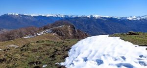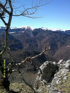 Nous laissons les voitures au-dessus du  col de Mortis sur le  parking d’une ancienne carrière d’extraction du magnésium  (1025 m), en plein coeur d’une forêt de hêtres et de sapins. Nous quittons assez rapidement la piste forestière pour emprunter un  sentier dont le dénivelé assez progressif nous laisse le loisir d’observer à mesure  les nouveautés  végétales de l’année (l’éllébore la scille, le lis, la  jacinthe de sous-bois… ). Les pluies récentes et la fonte en cours des dernières neiges  ont rendu glissants le tapis de feuilles et les roches où nous posons les pieds. Aux deux tiers du parcours, le sentier forestier se transforme en chemin de  crête  que nous suivons jusqu’au sommet, en admirant le  magnifique  écran de montagnes enneigées sur notre droite. L’à pic de la falaise que nous longeons  à distance  est assez impressionnant et sert  sans doute de voies d’entraînement pour les clubs d’escalade, ce que nous confirme  la lecture d’un panneau orné d’une corde d’alpiniste dédié à Bernadette de la part des Escapats.