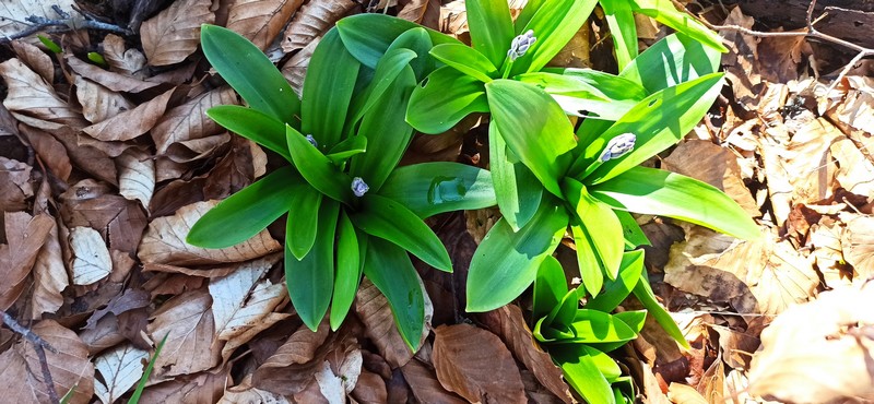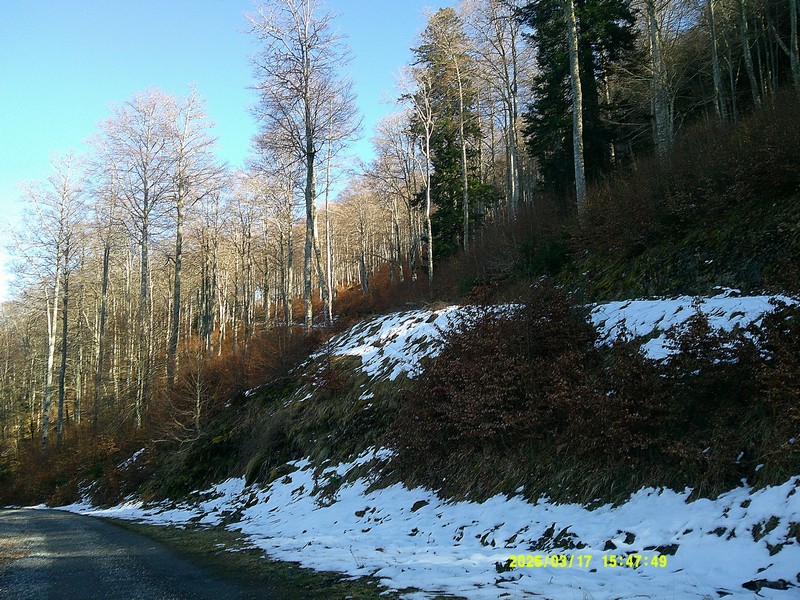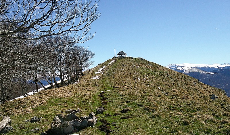 Nous laissons les voitures au-dessus du  col de Mortis sur le  parking d’une ancienne carrière d’extraction du magnésium  (1025 m), en plein coeur d’une forêt de hêtres et de sapins. Nous quittons assez rapidement la piste forestière pour emprunter un  sentier dont le dénivelé assez progressif nous laisse le loisir d’observer à mesure  les nouveautés  végétales de l’année (l’éllébore la scille, le lis, la  jacinthe de sous-bois… ). Les pluies récentes et la fonte en cours des dernières neiges  ont rendu glissants le tapis de feuilles et les roches où nous posons les pieds. Aux deux tiers du parcours, le sentier forestier se transforme en chemin de  crête  que nous suivons jusqu’au sommet, en admirant le  magnifique  écran de montagnes enneigées sur notre droite. L’à pic de la falaise que nous longeons  à distance  est assez impressionnant et sert  sans doute de voies d’entraînement pour les clubs d’escalade, ce que nous confirme  la lecture d’un panneau orné d’une corde d’alpiniste dédié à Bernadette de la part des Escapats.