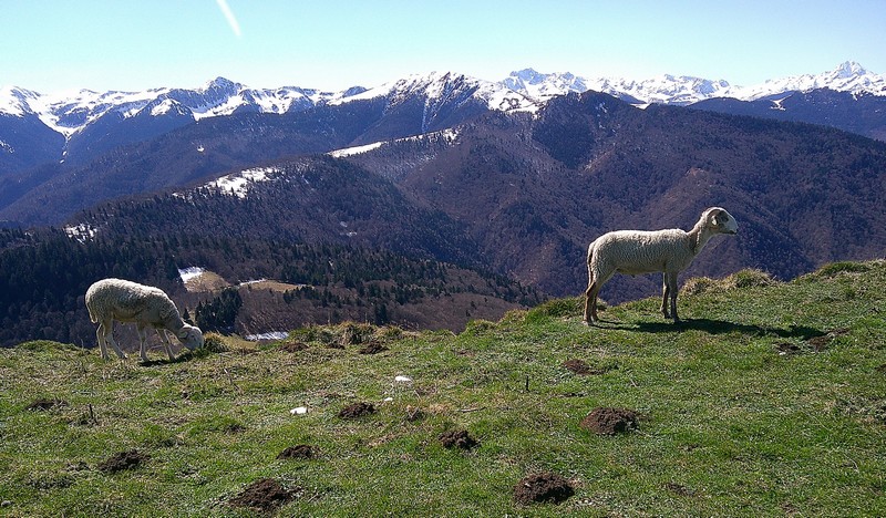 Nous  pique-niquons au sommet dans un cadre grandiose à côté de deux jeunes brebis dont on ne sait si elles ont faim de sel, ou de compagnie. Une table d’orientation  protégée par un abri ouvert nous aide à reconnaître les nombreux hauts  sommets de la chaîne des Pyrénées,  de l’Aneto au Pic du Midi de Bigorre.  Un panneau pédagogique nous apprend que l’abri a été bâti sur un sanctuaire antique composé de vestiges d’autels votifs d’époque gallo-romaine, possiblement dédiés à Jupiter, qui sont actuellement conservés au Musée St Raymond de Toulouse.