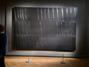 Partenaire du musée Goya, le musée Soulages a prêté l’un des fameux outre noirs de l’artiste ruthénois : les queues de morue, le brou de noix et l’encre d’imprimerie sont les premiers outils de sa révélation artistique. Travaillant d’abord à la peinture à l’huile puis à la peinture acrylique à partir de 2004, Pierre Soulages fait naître les effets de lumière depuis le fond le plus obscur de ses toiles.