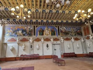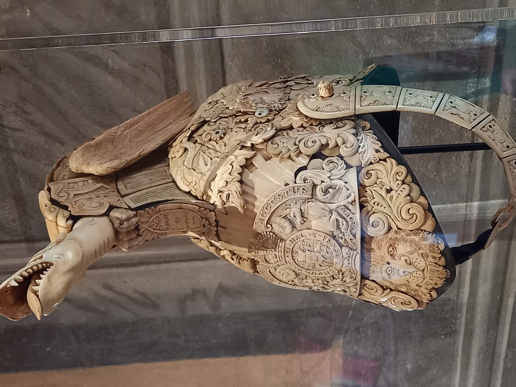 Nous voici dans la salle des Etats Diocésains couronnée d’un plafond à la française aux poutres apparentes. Sur la partie supérieure murale se détachent les armoiries des 35 évêques de Castres, du Moyen Age à l’époque moderne ainsi que l’évocation du passage du roi de France Henri IV à Castres en 1585. Des différents objets meublant cette pièce, on retiendra le casque d’apparat en ivoire du Roi George II d’Angleterre porté lors des cérémonies ou de grandes parades équestres. Un arrêt s’imposait devant cette réalisation offerte par le roi à Jean Louis Ligonier (1680-1770), maréchal français ayant combattu pour l’Angleterre