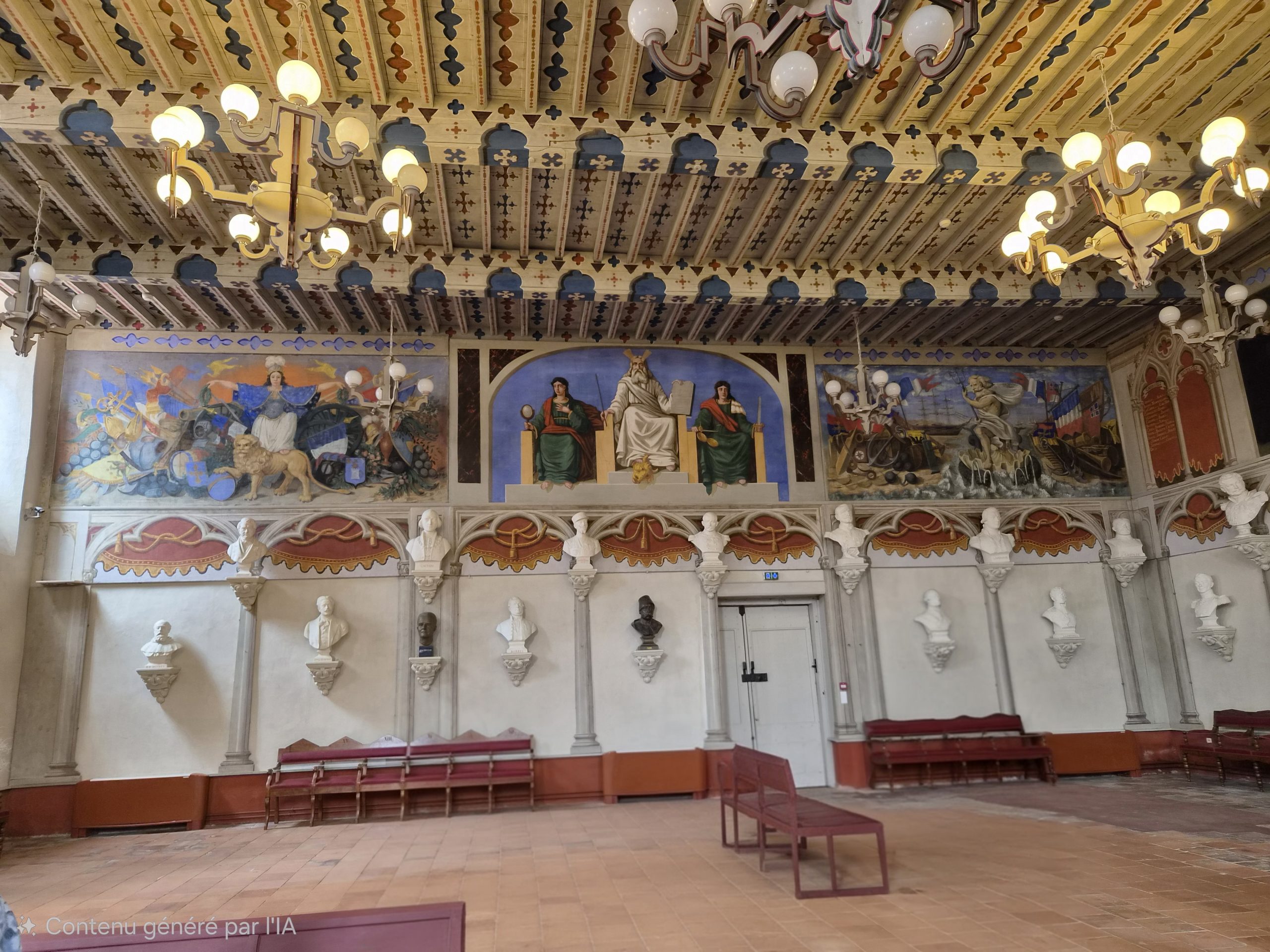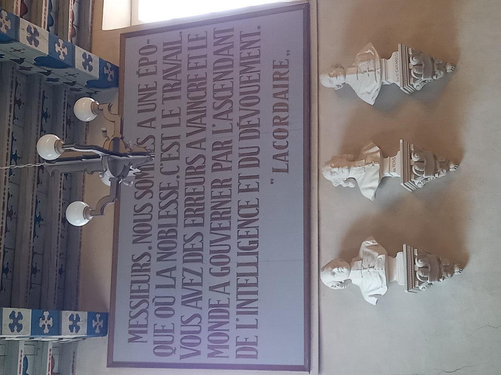 Nous prenons le loisir d’admirer cette salle décorée de fresques, de peintures réalisées au XVIII° par les élèves et d’un plafond à la française du XIX° aux couleurs de la république. La pièce accueillait les cérémonies des récompenses et des fêtes. Aujourd’hui, les bustes des cinquante-trois élèves les plus célèbres toisent les visiteurs. De grandes personnalités ont fréquenté les bancs de l’école . On retiendra les noms de Jean-Pierre Fourcade, Gilles des Robien, Jean Mistler ,secrétaire perpétuel de l’académie française dont les textes racontent la vie de l’école au tournant du XX°. A noter aussi les noms d’Hugues Aufray, Igor et Grichka Bogdanoff et Claude Nogaro…
