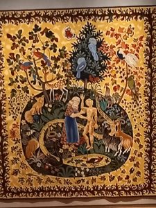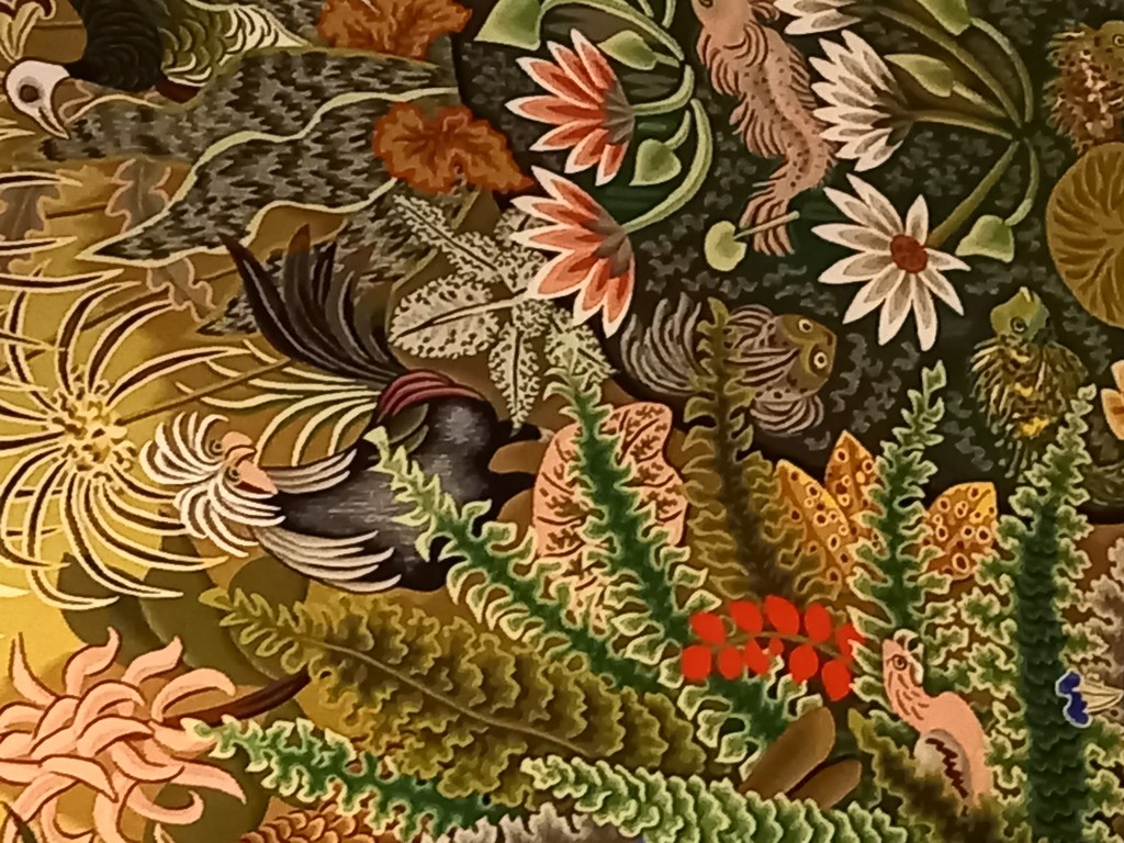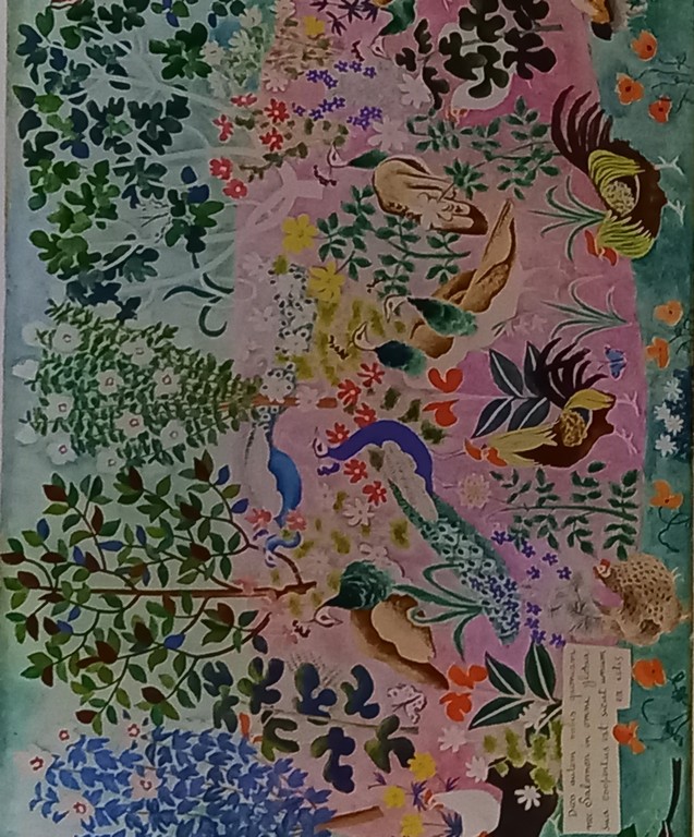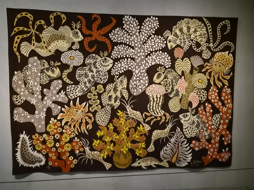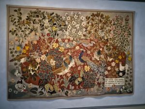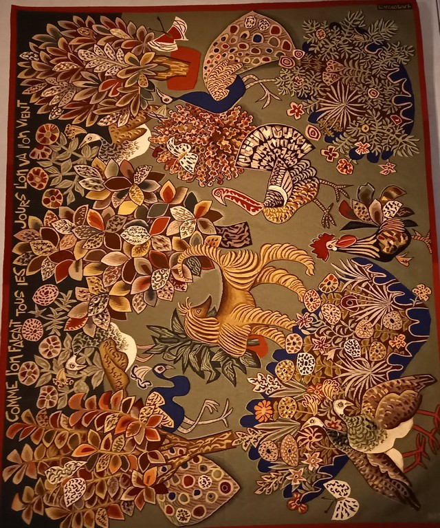 Nous ne pouvions pas quitter l’exposition consacrée à Dom Robert, véritable créateur capable de mêler spiritualité, observation du monde vivant et recherche artistique sans poser notre regard sur l’une des dernières tapisseries présentées, « Mille-fleurs sauvages » réalisée d’après un carton datant de 1961 sur le thème de la prairie fleurie chère à Dom Robert : elle incarne toute l’âme du peintre cartonnier : la nature et ses couleurs vibrantes .