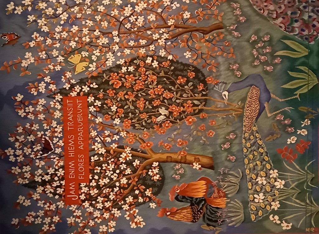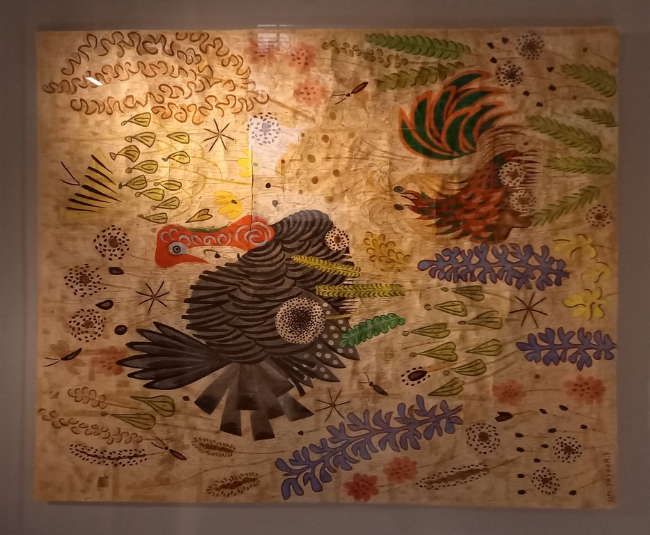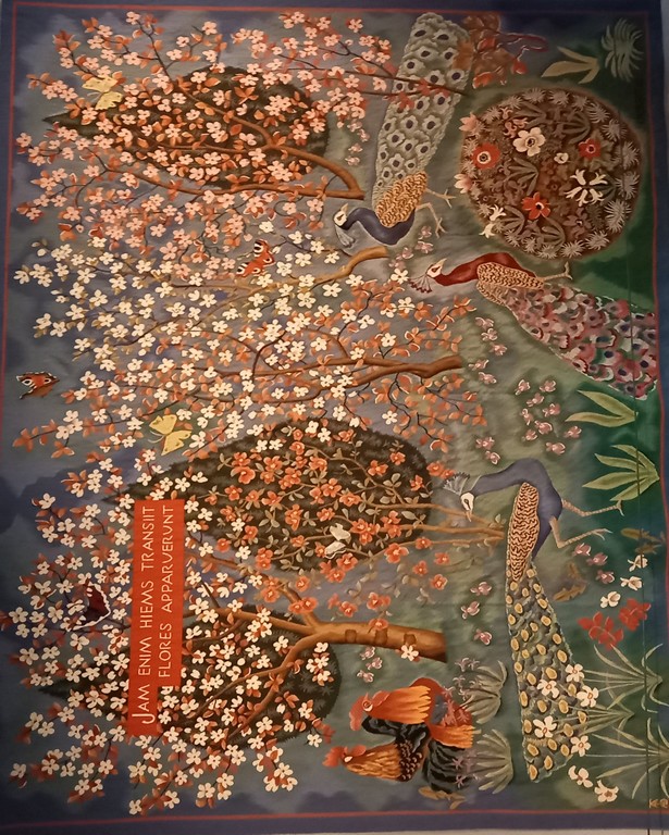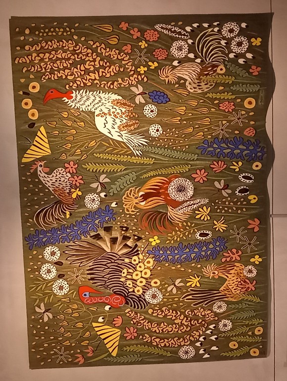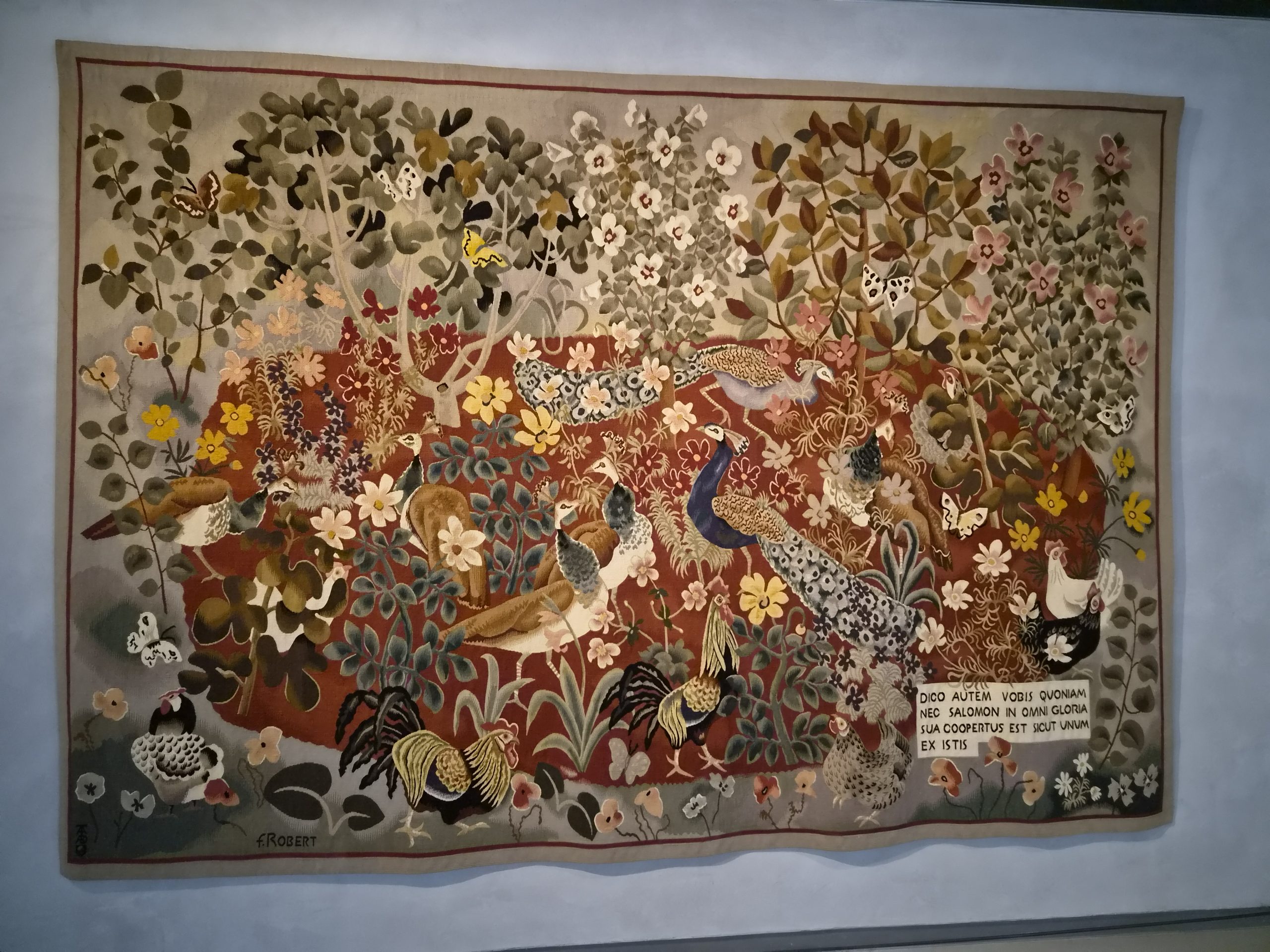 Nous entrons dans l’univers coloré et foisonnant des dessins et tapisseries, un univers très vivant surprenant par rapport à ce que l’on attend habituellement d’un artiste religieux.« Petit coq » est un détail de la tapisserie « l’herbe haute » datée de 1961. « La ferme de Palaja », une aquarelle de 1940, un dessin fait comme un aveugle » dira l’artiste. « Paonne », un résidu du premier carton de tapisserie « l’Eté » : pour donner naissance à une nouvelle tapisserie, Dom Robert coupe le carton et ne retient qu’un détail de l’oeuvre originelle. En 1967, le gouvernement français a conféré aux tapisseries brodées le statut juridique « d’ oeuvre d’art » limitant ainsi à huit le nombre de reproductions de chaque carton .