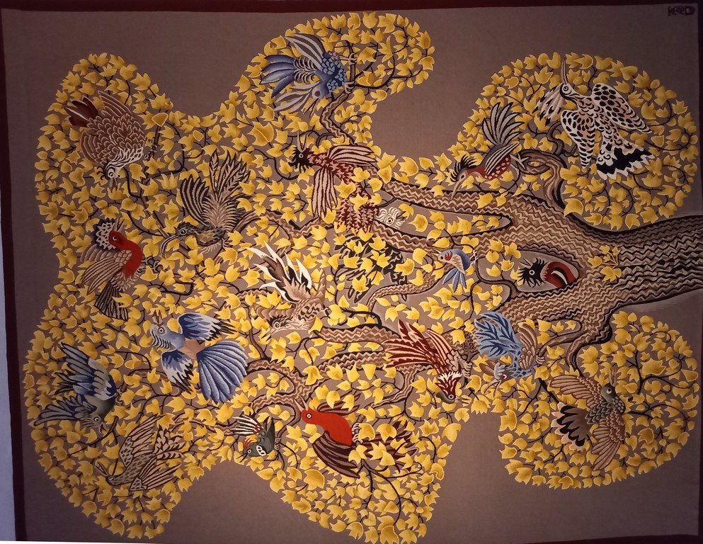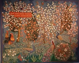 Les tapisseries de Dom Robert, ce ne sont pas des champs verdoyants, un arbre qui fleurit ou une mare paisible, mais bien le bourdonnement de l’abeille, le battement d’aile du papillon, le pépiement de l’oiseau, le bondissement du chien, le chat qui se faufile avec souplesse, des coqs espiègles, des paons , des chevaux fougueux , des scènes champêtres de style naïf colorées et exubérantes de nature.
