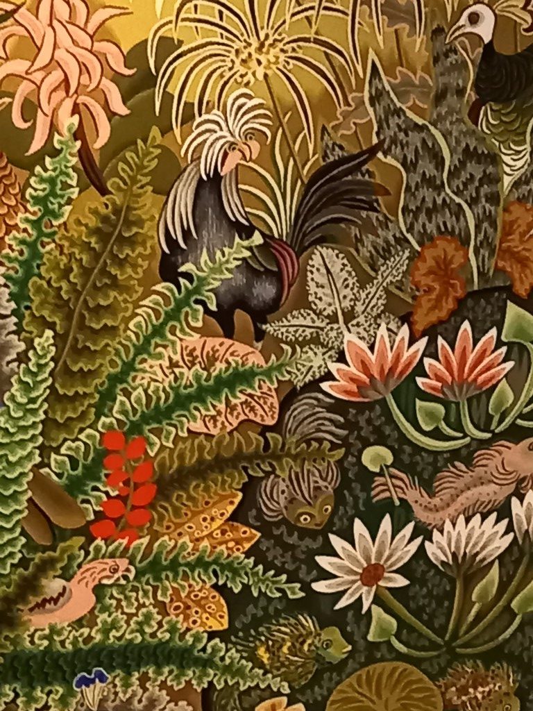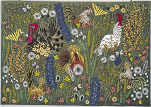 Nous laissons à regret les animaux de basse-cour aux plumages ébouriffés dansant dans une jungle de fleurs des champs.