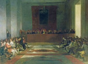 La troisième œuvre offerte est l’ un des tableaux acquis en 1881 par Marcel Briguiboul lors d’un voyage à Madrid « La Junte des Philippines »,la plus grande peinture d’Histoire réalisée par Goya. Bien que l’oeuvre ait été commandée pour mettre en valeur le cérémonial, la lumière met en évidence de manière peu flatteuse la centralité d’un roi impuissant représenté en grande pompe flanqué des ses deux conseillers. L’assemblée, des actionnaires gérant les intérêts financiers espagnols en Extrême Orient est divisée en deux sur des bancs parallèles séparés par tapis inondé d’une éblouissante clarté et semble très peu attentive au discours du monarque… La satire sous entend ici la critique sociale.