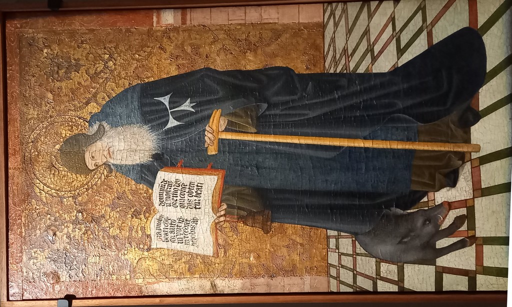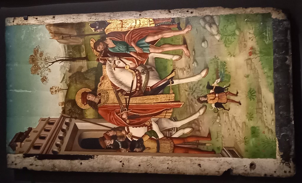 Nous nous attardons devant le panneau représentant Saint Martin coiffé de son chapeau rouge offrant un pan de son manteau à un mendiant.