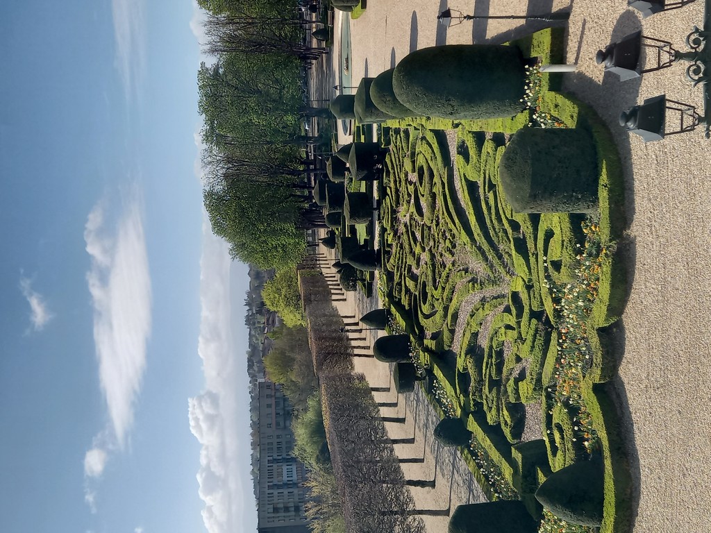 Nous traversons une longue galerie vitrée. L’occasion idéale d’admirer le parc que nous avions rapidement traversé à notre arrivée. Il faut avouer que le temps maussade n’incitait pas à flâner dans les allées de ce jardin d’agrément à la française créé en 1876 par Monseigneur de Maupéou… Composé de parterres de buis, de broderies et d’arabesques à la manière des jardins royaux aménagés par André Le Nôtre, l’ espace verdoyant à été achevé en 1700.